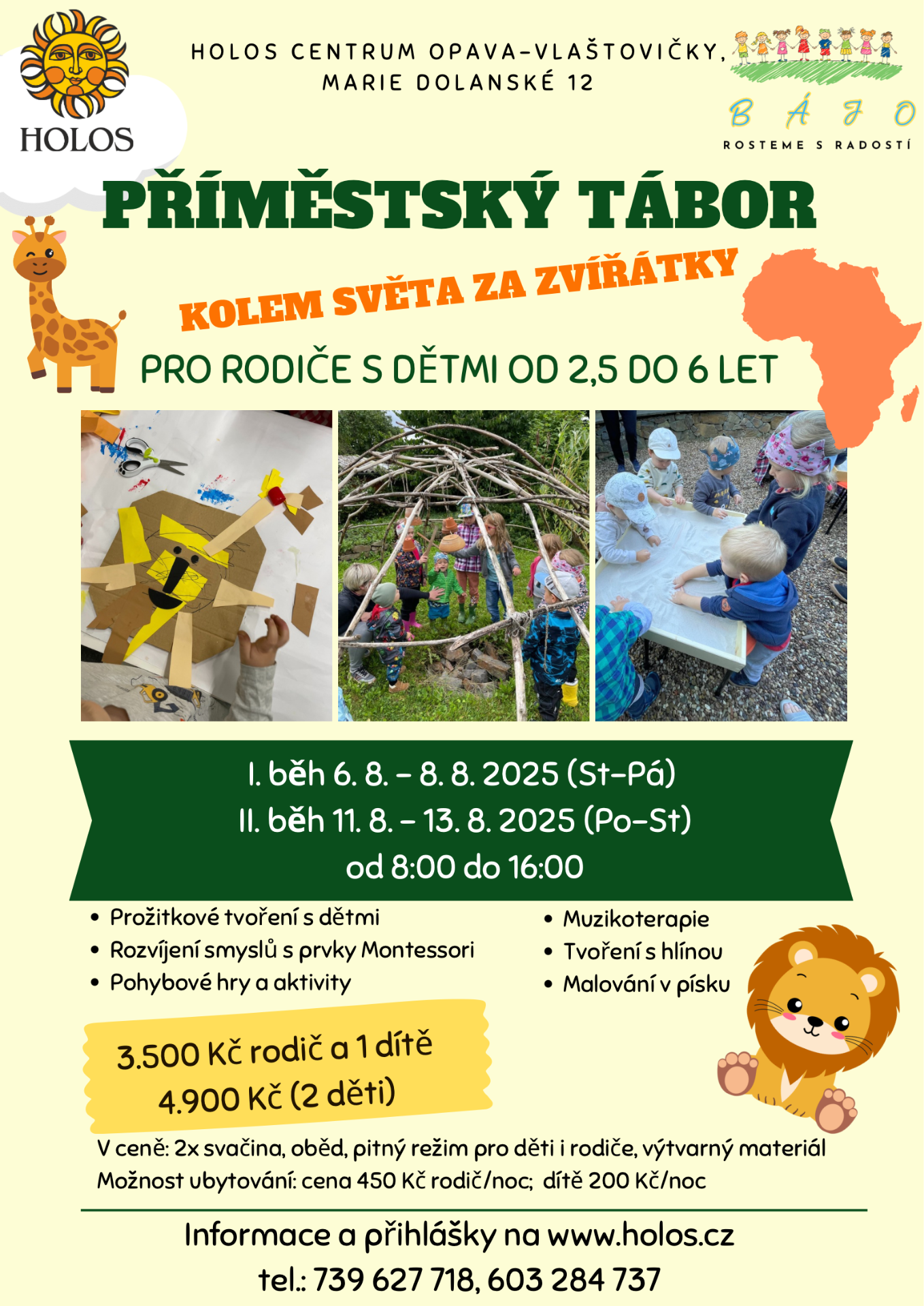 Pořádáme příměstské tábory pro rodiče s dětmi ve věku od 2,5 do 5 let a příměstské tábory pro děti ve věku 6 až 12 let. Tábory již tradičně probíhají v krásném prostředí Holos Centra v Opavě Vlaštovičkách.